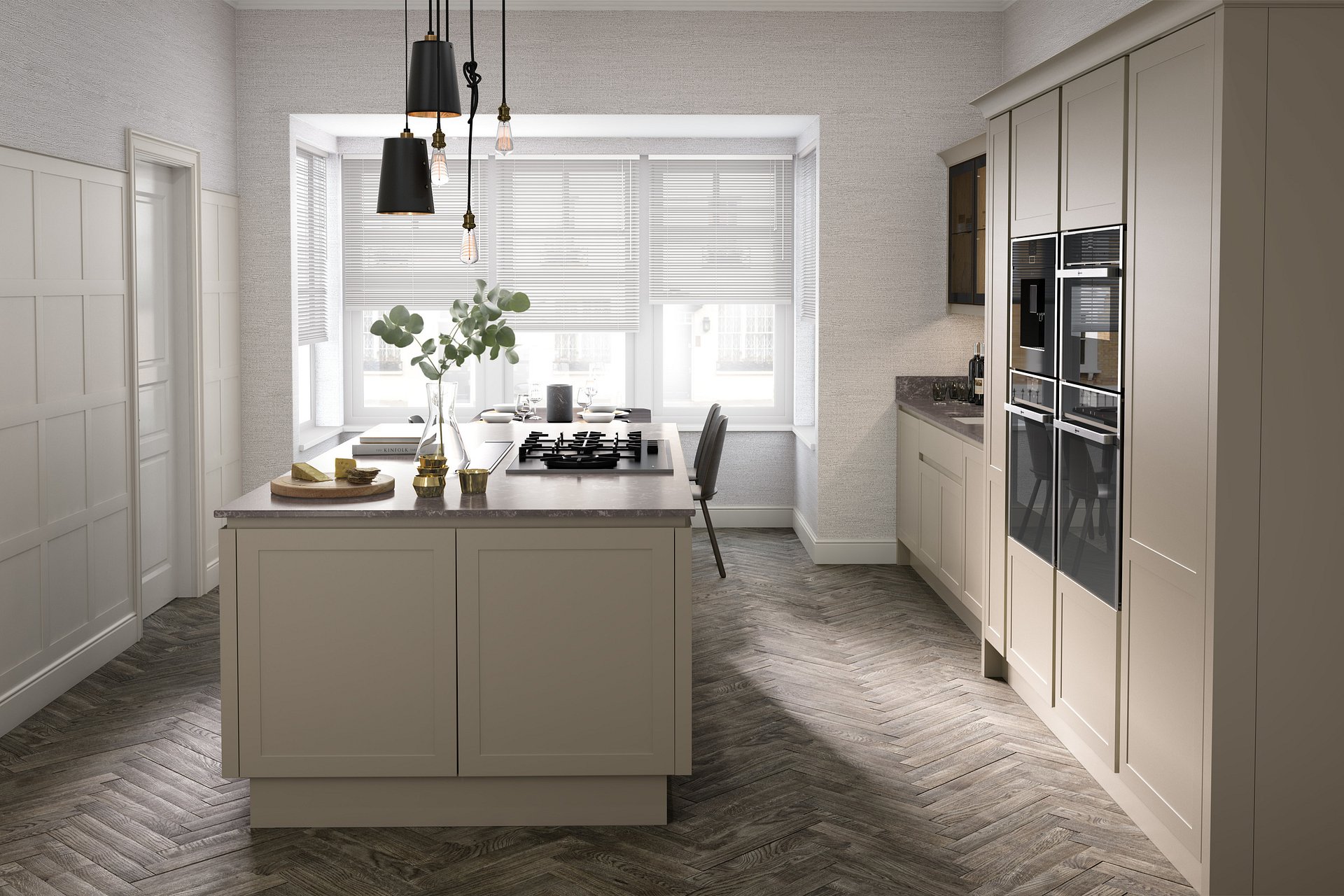 The client's wanted the kitchen to have a classic but timeless look in keeping with the theme of the rest of their house. With this in mind they opted for a gorgeous shaker door with intricate frame detailing, in both Dove Grey & Slate. The main requirement was a large island to be the centrepiece of the room. They wanted the island to run the full length of the kitchen and to include a seating area, lots of storage and generous worktop space for prepping and cooking food.
